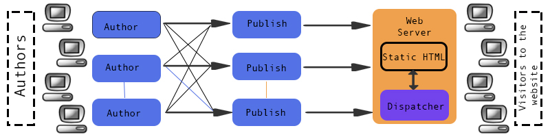 The AEM server can function in two modes: author and publish. In the author mode, the instance is used to set up the platform and to create content, whereas, in the publish mode, the instance conveys the content to the clients. The number of author and publish instances do not have to be correlated, and AEM provides a mechanism of data replication from the author, on publish. Thus, the uploading on servers is distributed, and a high activity of the editors will be felt only on the author instances, without affecting the performance for the clients, since they connect to publish. Adobe also offers a separate module, called Dispatcher, which has the cache and load balancing functions. The responsibility of managing the cache is taken off the programmers' shoulders, since the Dispatcher automatically invalidates the cache the moment when a page has been modified.