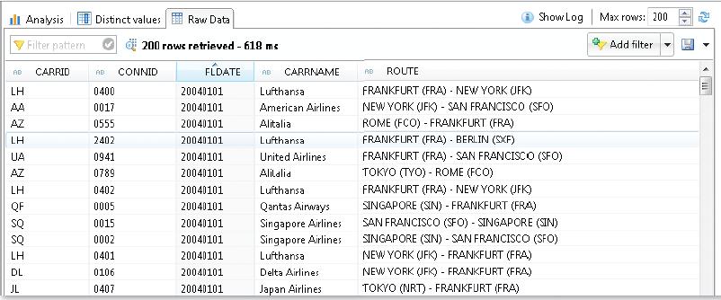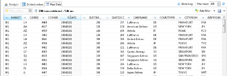 We will add the SCARR and SPFLI tables to the SFLIGHT view, and the result shows you the name of the airline company, information about the departure and the destination of each flight (see Figure 4).